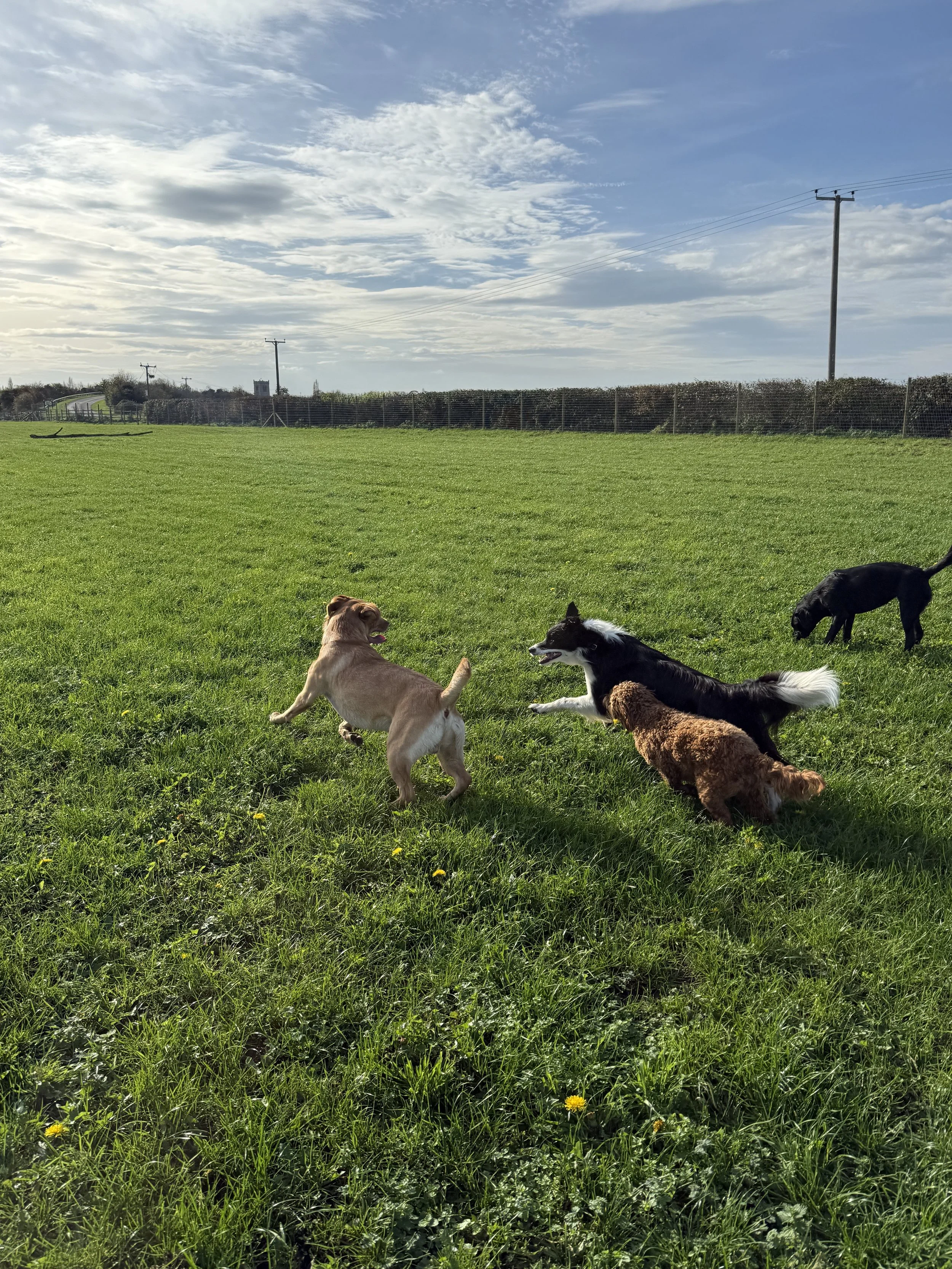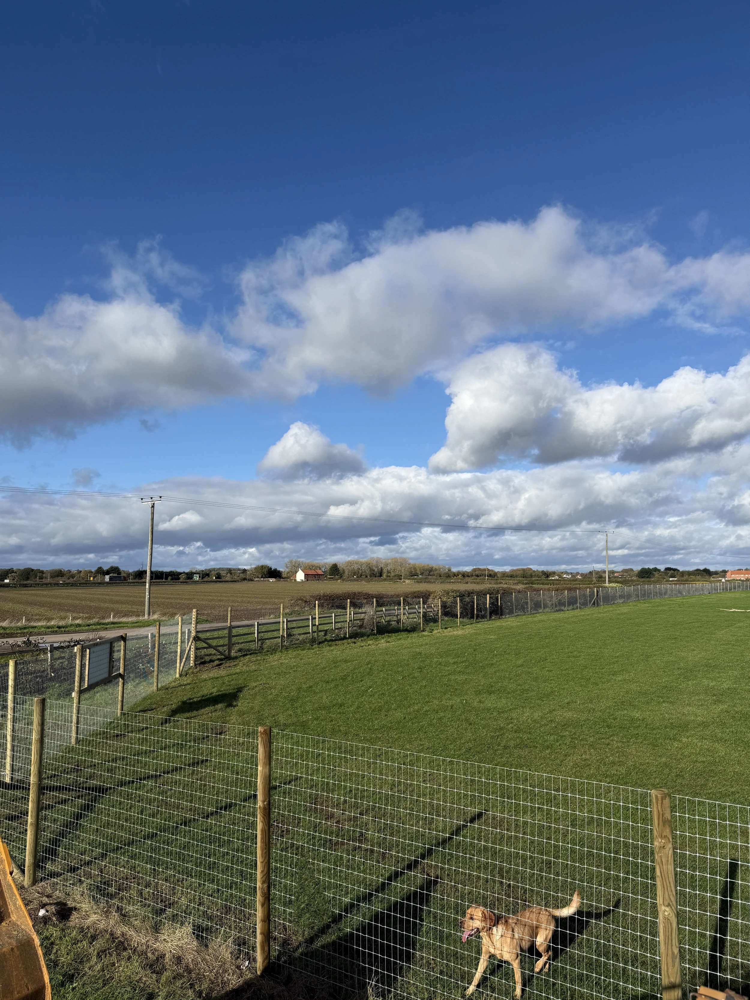 Whilst we’ve made the field as secure as possible, there is the occasional rabbit hole dug under the fence overnight, which we may not spot straight away. Please also be aware that there is traffic along the nearby road, as well as passing farm vehicles — something to bear in mind if your dog is reactive to cars.
